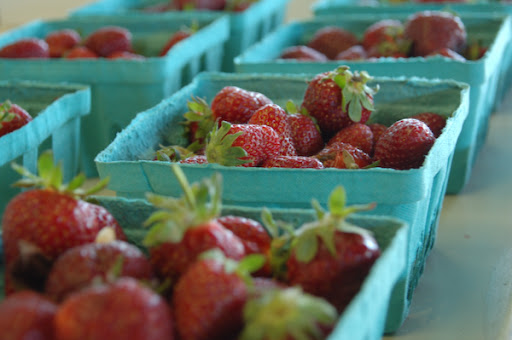 The fresh strawberries look mouthwatering sitting in their blue containers…
