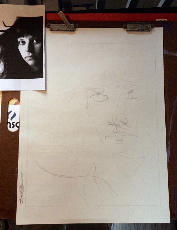 Well, here we are…an update! What I have decided to create for my self portrait is actually a hand drawn embroidery design. I started by taking a few selfies on my computer and breaking it down to a simple black and white image so I could better easily descern the highlight and shadows along with the mid-tones. From that image, I worked a simplified drawing, breaking out the different sections.