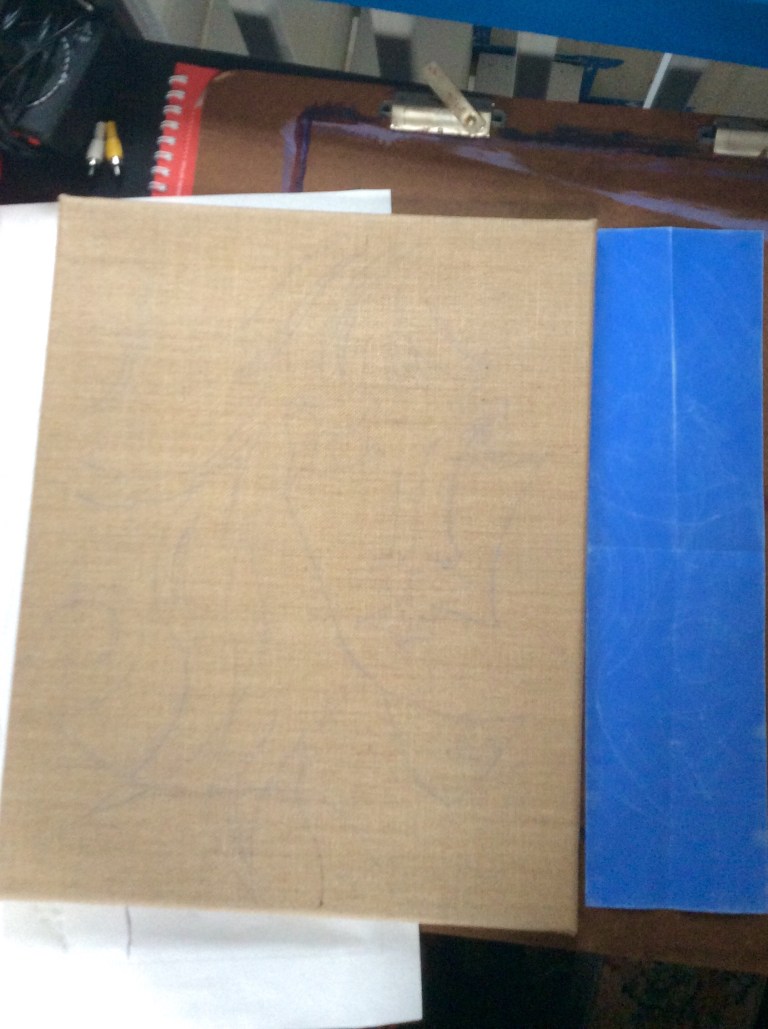 From there, I wanted to transfer my design over to a piece of burlap. To do this, I used quilter’s transfer paper. These papers come in different colors and, after a couple of tests, I discovered the that the blue showed up the best.