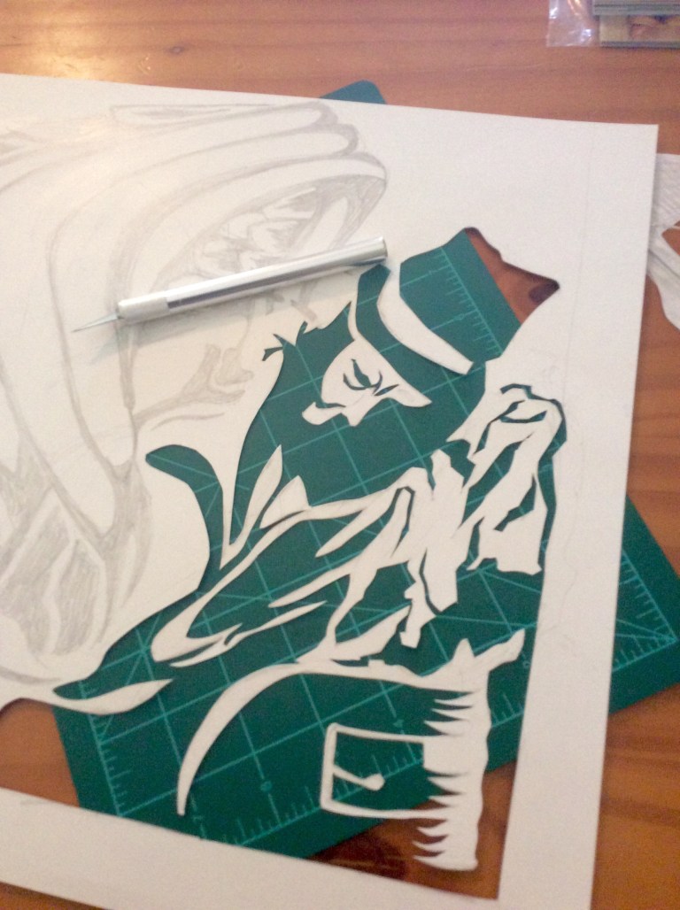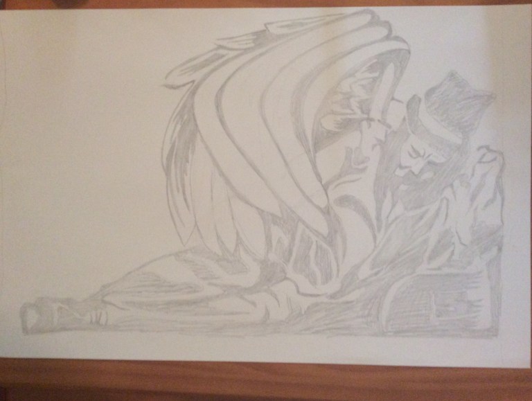 So, I just had the most exciting time creating a stencil for my Design class. The assignment called for us to design an image (text may be used, I did not) then spray paint it onto a piece of white foam core (no actual wall tagging here – lol). We had to have some sort of message to convey. It could be religious, political, satire, humorous, etc, just as long as it meant something. After thinking long and hard, I got inspired by the Gospel of Matthew and the Sermon on the Mount. In chapter 5, verse 3, Jesus says “Blessed are the poor in spirit: for theirs is the kingdom of Heaven.” This beatitude spoke to me at this time in my life and I felt the need to illustrate it. I chose a homeless man, sleeping against a wall. Around this poor soul, wraps an angel’s wing, enveloping and cradling him. I really love the way this has turned out and I hope you enjoy. Maybe someday, I’ll be able to make it life size. I’ve attached the progression of the work.
